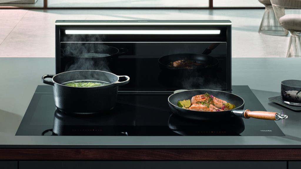 Soluțiile downdraft Miele sunt integrate direct în blat și acționează exact acolo unde este nevoie. Aburul și mirosurile sunt captate imediat, fără a afecta estetica spațiului.