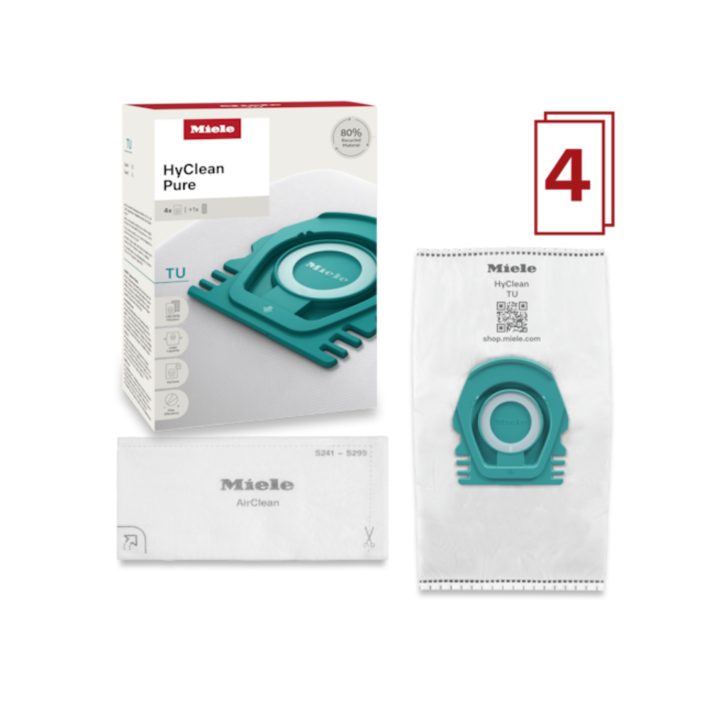 Set 4 saci aspirator Miele TU HyClean Pure, compatibili Guard L1/S1, pentru filtrare eficientă și igienă ridicată.
