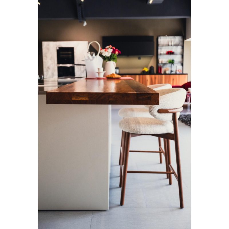 Zonă de luat masa tip bar realizată din lemn, pentru un contrast natural și cald.